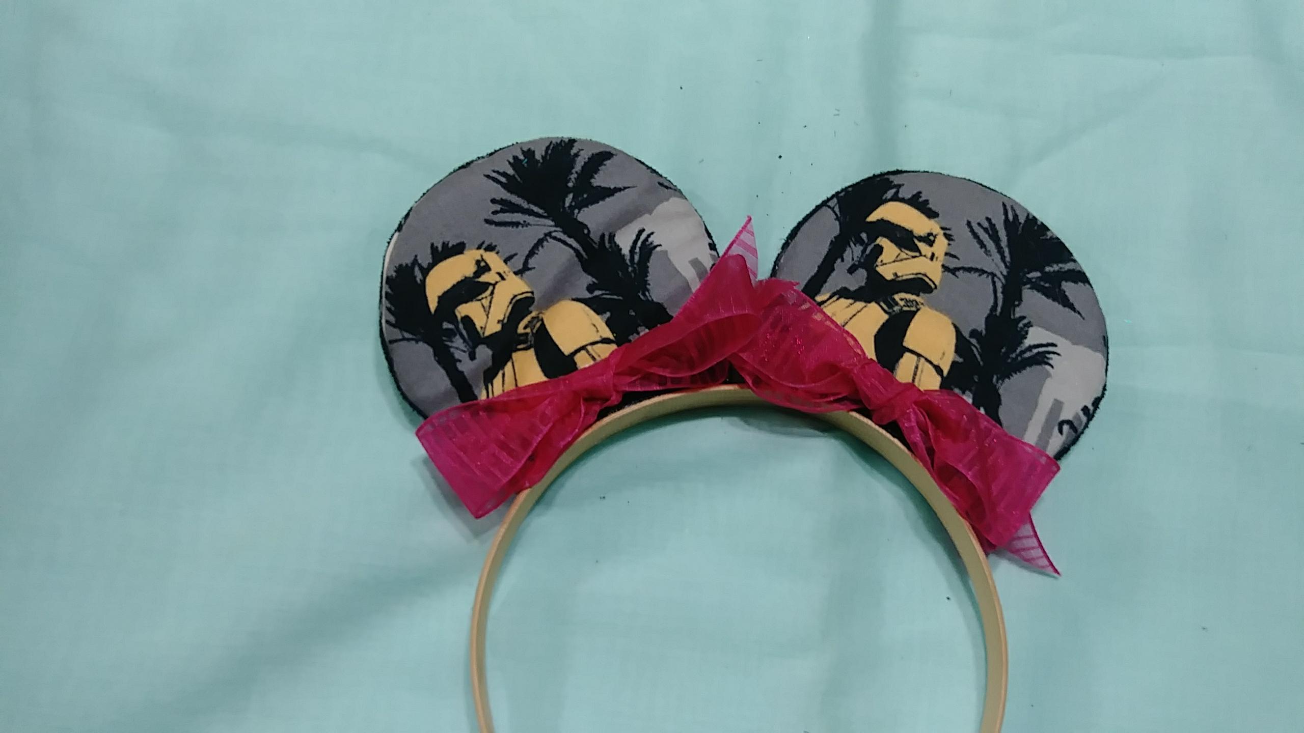 Darth Vader with white bow with black touch. The back of the ears are finished in black glitered laced and black and with ribbons to finsh the look. Pink ribbon and black trim are used to finish the sides.
