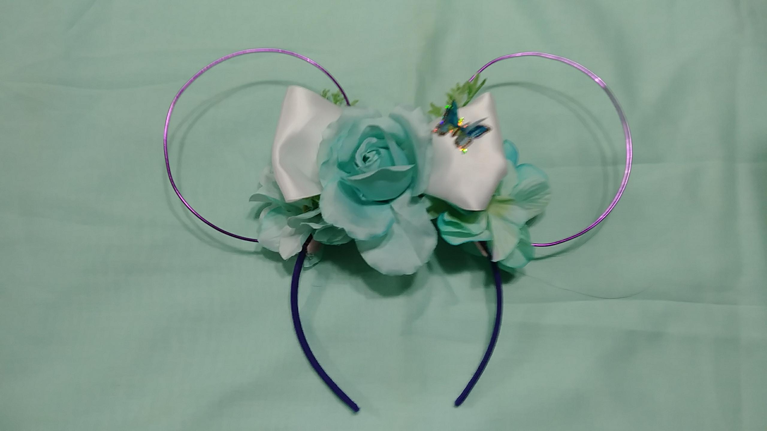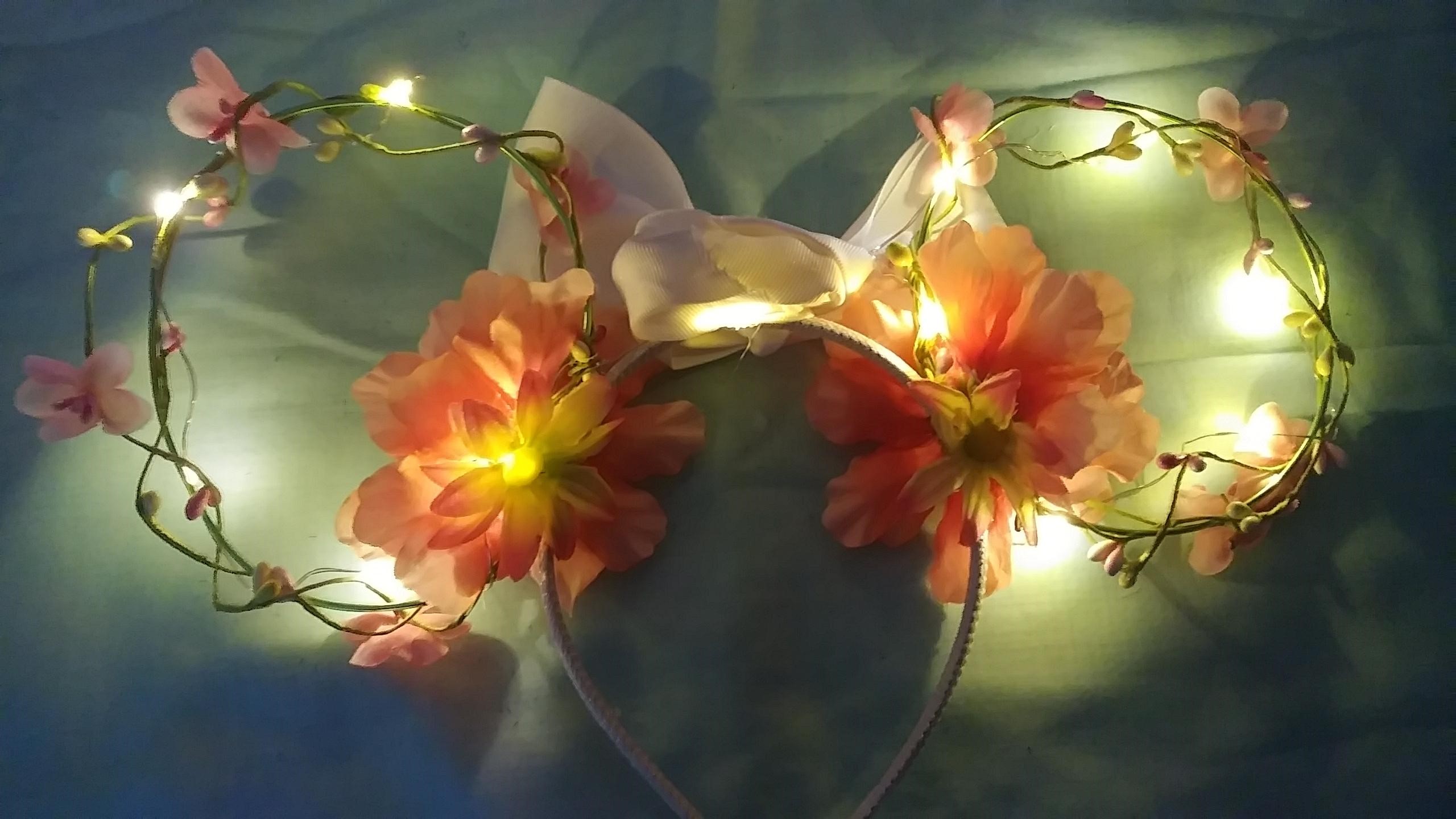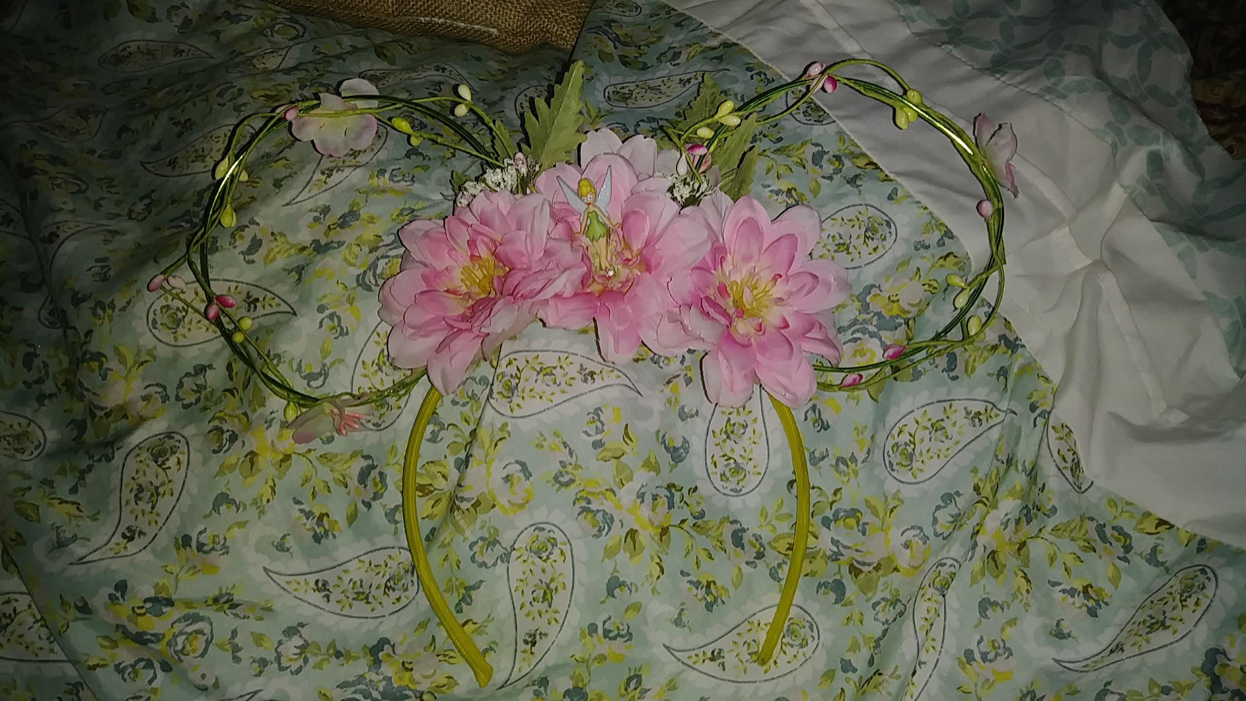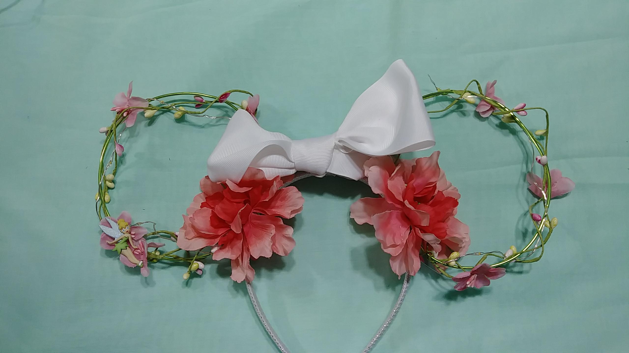 This set of ears has Pink Flowers twined around green wire to accent a flirty Tinker Bell.