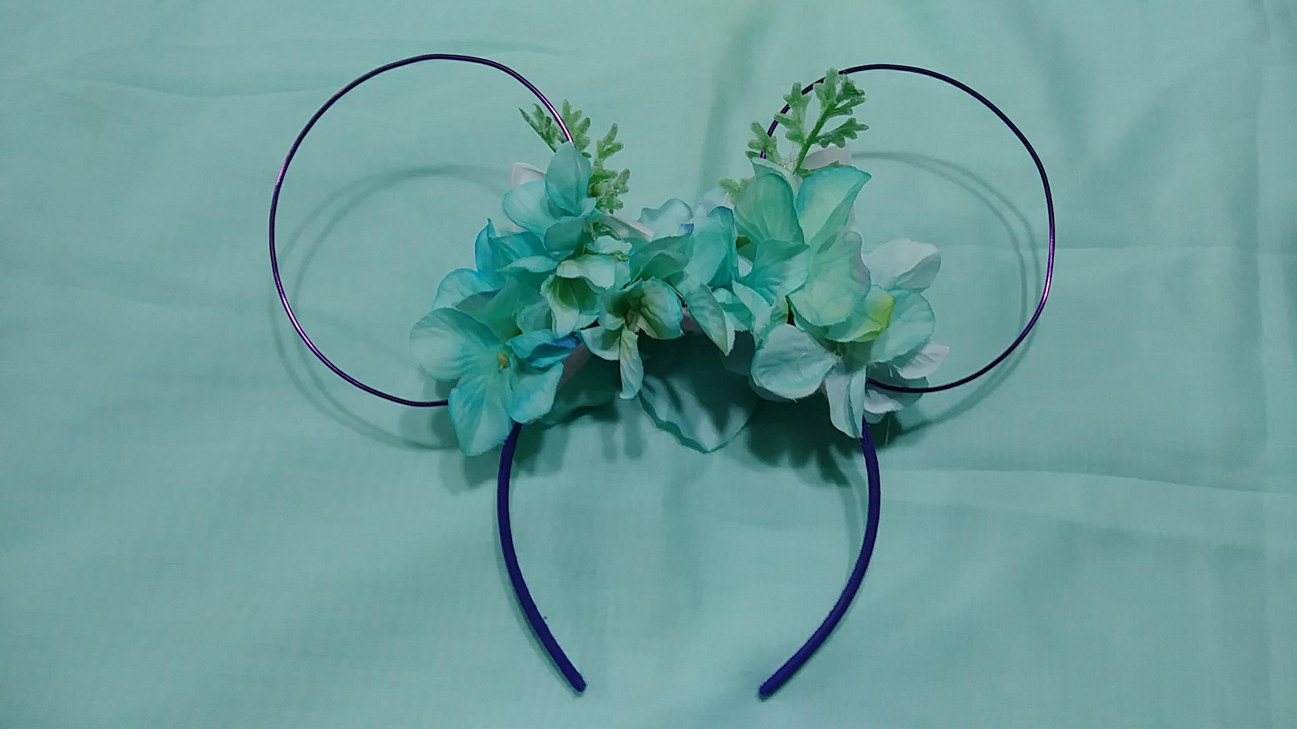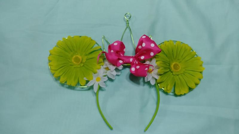 These ears are made with beautiful spring daisies with a green wire crown and a pink bow to finish it off.